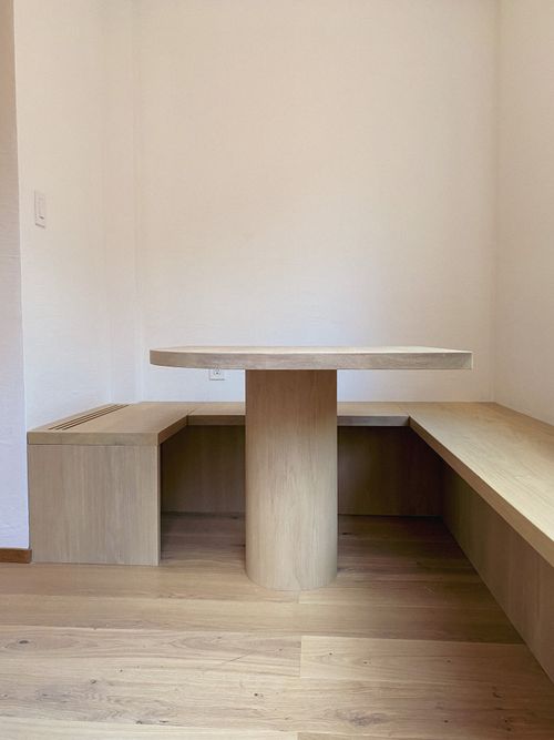 A mudroom turned breakfast nook, with wrap around bench, fixed table, and removable radiator cover for accessibility.