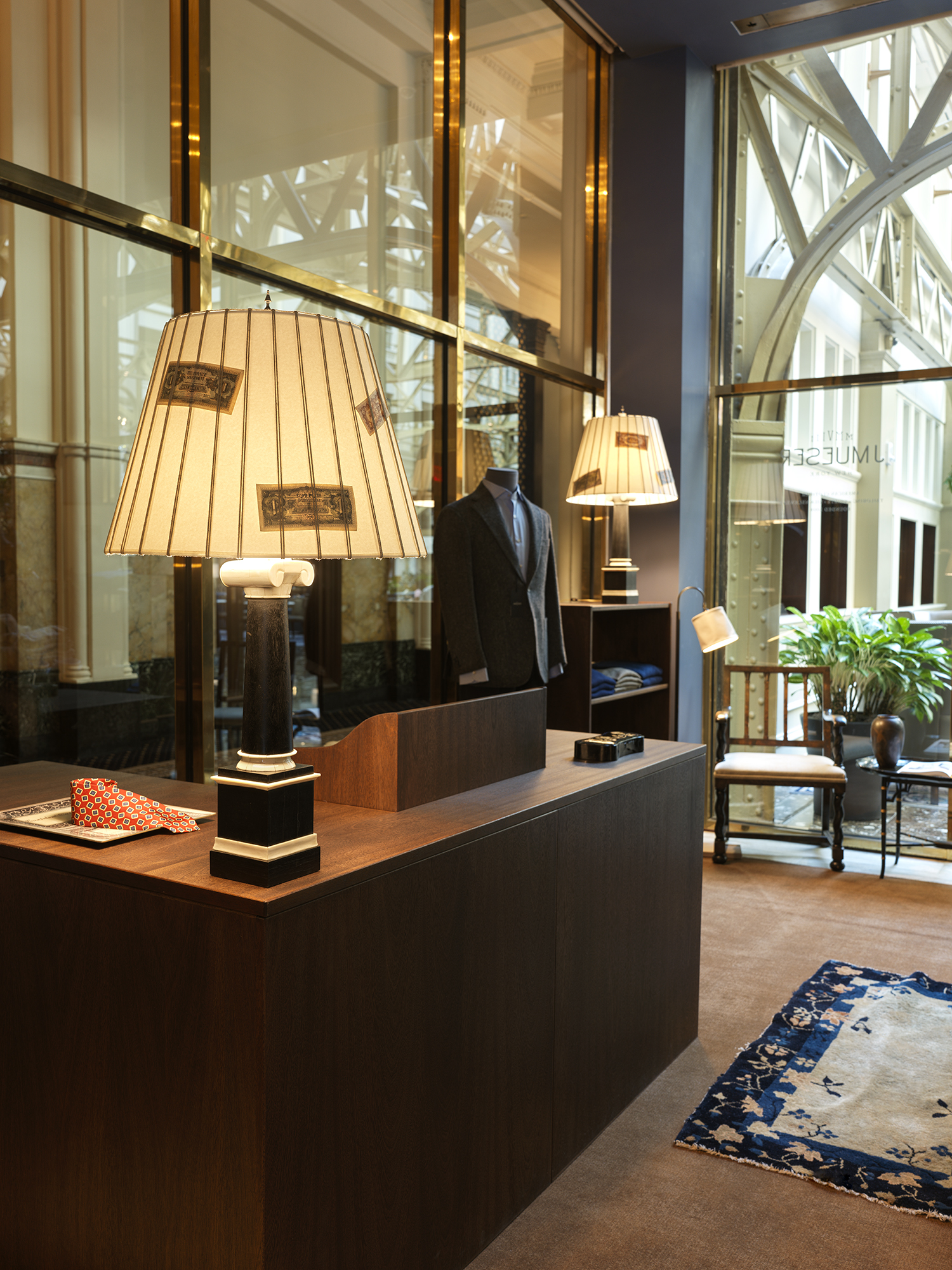 Custom POS counter with extensive counter space to accommodate handling of merchandise, and two shelving units, for The Post Collection at the historical Waldorf Astoria in Washington D.C. Sapelle hardwood with hard wax finish.
